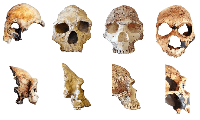 Zuttiyeh, Arago 21, Skhul V, Shanidar 5 (side view mirrored). Credit: 1=Pierre-Francois Puech; 2,3,4=Roberto Sáez