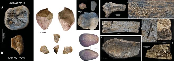Materiales de en Nyayanga, de izda a dcha: molares de Paranthropus, artefactos olduvayenses, huesos con marcas de corte de hipopótamo (A, B) y bóvido (C, D). Crédito: T. W. Plummer et al (2023)