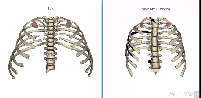 Recordemos cómo es la caja torácica de los neandertales adultos: más corta, algo más profunda y mucho más ancha que la de los humanos modernos, relacionada con la anatomía general robusta de los neandertales, manifestada en los huesos, inserciones musculares, pelvis, etc., y también relacionada con las exigencias de su metabolismo, y su alta demanda de energía y oxígeno (tal vez llegaban a gastar el doble de calorías que un humano actual en sus actividades normales).