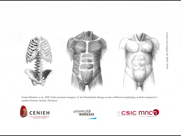 Ahora veámoslo desde la perspectiva de la otra especie: los neandertales y su caja torácica. Un nuevo estudio recién publicado muestra que los neandertales al nacer ya tenían una caja torácica similar a la adulta, gracias a la reconstrucción virtual de esta parte esquelética a partir de cuatro individuos neandertales, desde el nacimiento hasta los tres años de edad: Mezmaiskaya 1 (Rusia), Le Moustier 2 (Francia), Dederiyeh 1 (Kurdistan Sirio) y Roc de Marsal (Francia).